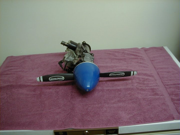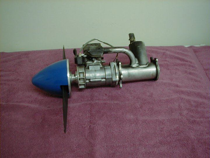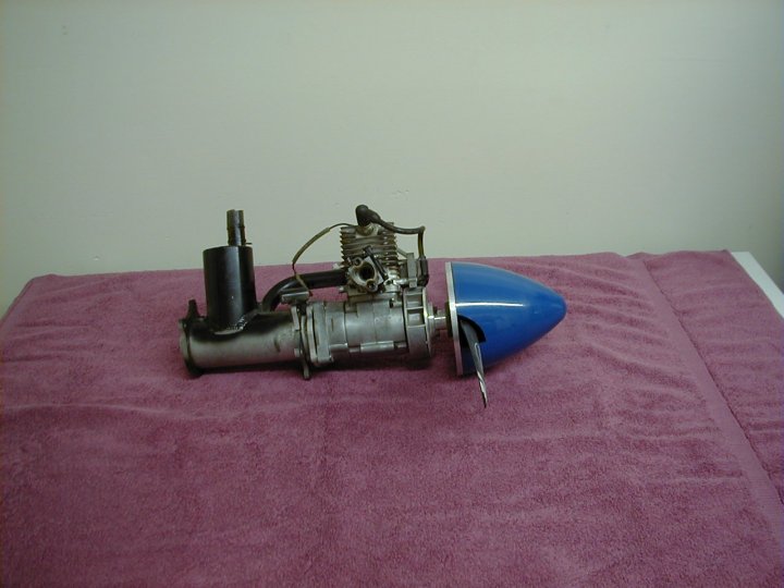 This drive unit was designed and sold by Byron Originals for the Mustang as a second alternative to the reduction drive unit. It was found that it gave a performance advantage to those who were not particular about scale flight and the big prop. It turned a regular two blade prop driven direct by a Quadra 50. It also included the Byron Purr-Pwr tuned muffler system.