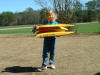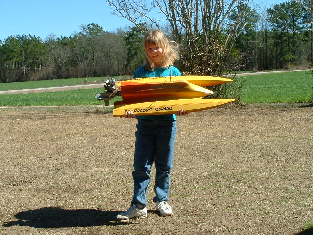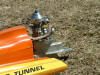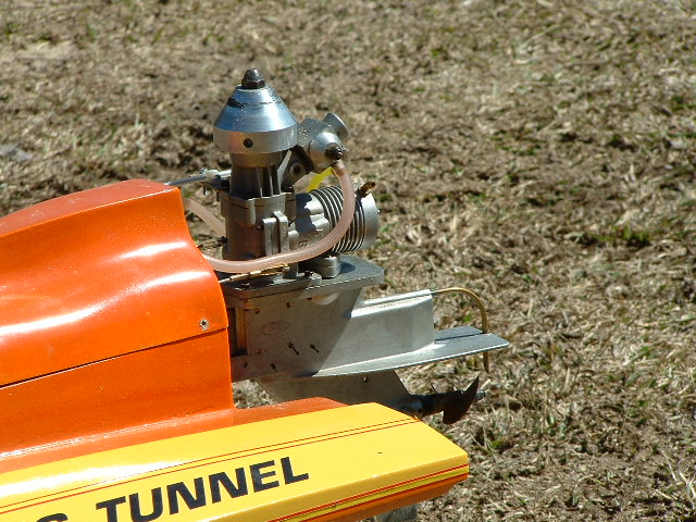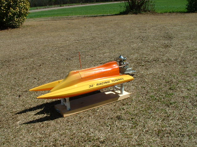 Just something to make a hot afternoon a little bit cooler. This 32 inch Tunnel Hull, a Prather kit, is powered by a K&B 7.5 outboard.