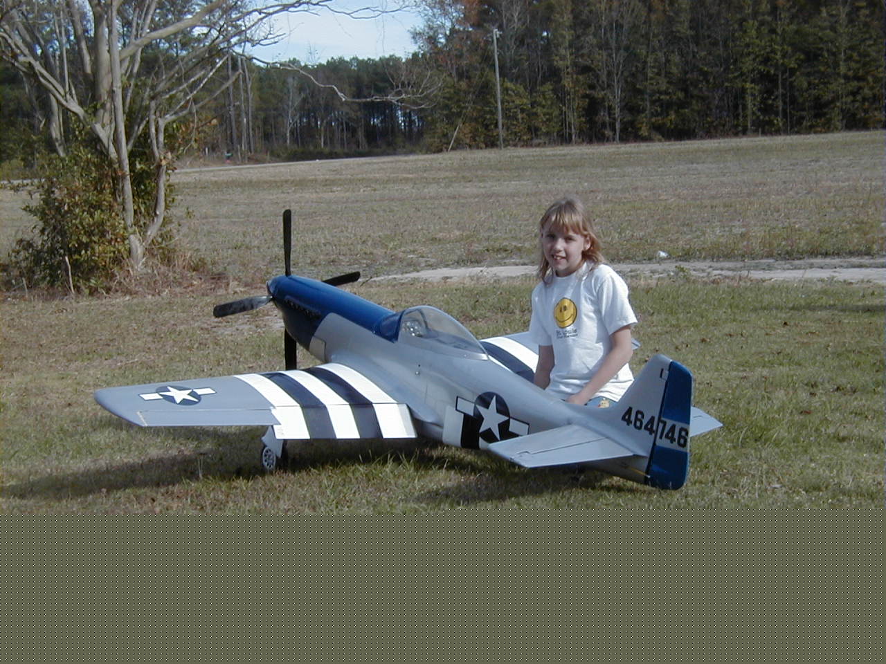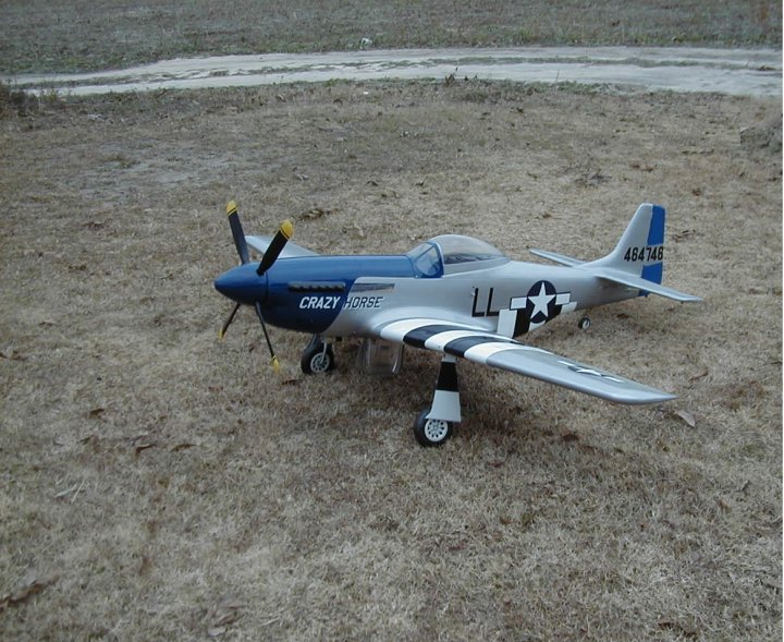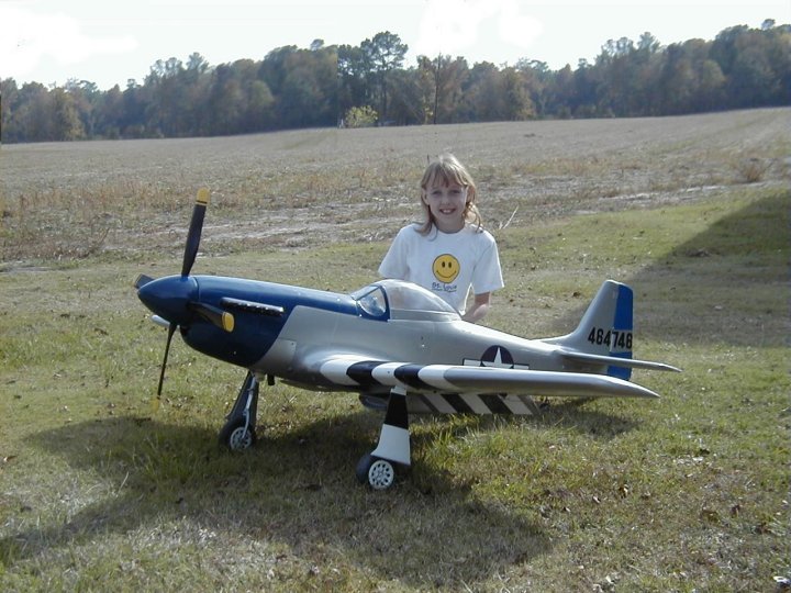 Yes......... both of them, my daughter and my Byron's Mustang. The first four pictures were taken prior to the lettering being done so you will notice it is missing. The Mustang was done after the full scale Mustang, Crazy Horse, which I had the opportunity to fly and the story of that adventure can be read on this site also. This one is powered by the famous Byro-Drive reduction unit that Byron Original's designed especially for their Mustang to reproduce the large slow turning four blade prop the Mustang is famous for. I currently have five of these Mustangs in my stable, one which is still in new kit form, two that are in restoration from mishaps or just hangar rash and age, and one that is about 85% complete and the one you see here. Pictures of these will follow as they become available.